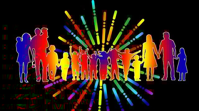 Stilisiert sind hier bunt dargestellte Menschen vor einem schwarzen Hintergrund zu sehen. Farbige Linien laufen auf die Mitte zu.