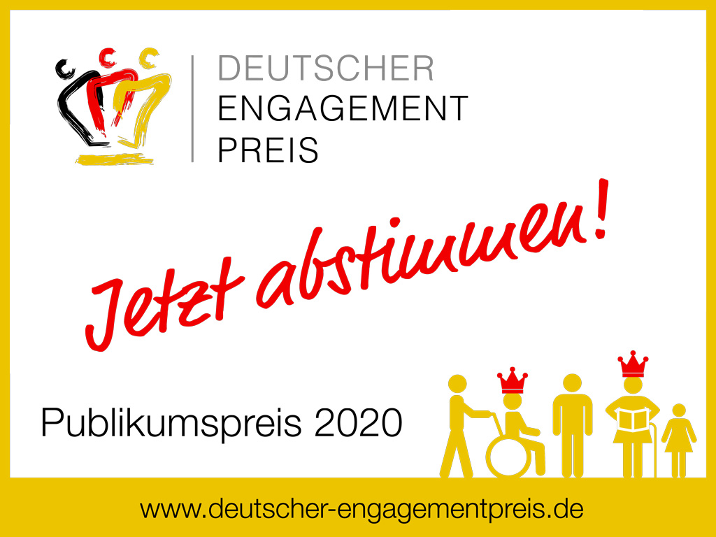Die Abstimmung über den Publikumspreis des Deutschen Engagementpreises ist gestartet. Bis zum 27. Oktober sind alle Bürgerinnen und Bürger eingeladen, auf www.deutscher-engagementpreis.de/publikumspreis für ihre Favoriten abzustimmen. 383 herausragend engagierte Personen und Initiativen haben die Chance, die bundesweit renommierte und mit 10.000 Euro dotierte Auszeichnung zu erhalten. Die 50 Erstplatzierten der Abstimmung gewinnen außerdem die Teilnahme an einem gemeinsamen Weiterbildungsseminar zu Öffentlichkeitsarbeit und gutem Projektmanagement in Berlin.