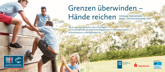 „Grenzen überwinden – Hände reichen“ ist das Motto des Schleswig-Holsteinischen Bürger- und Demokratiepreises im Jubiläumsjahr der friedlichen Grenzziehung zwischen Deutschland und Dänemark vor 100 Jahren. Der Bürger- und Demokratiepreis 2020 richtet sich an alle, die das Ziel haben, durch das Überwinden unterschiedlichster Grenzen die Gemeinschaft zu stärken und das Zusammenleben aller solidarisch zu gestalten. Menschen, die Grenzen überwinden – seien es soziale, kulturelle, geografische, politische oder auch persönliche – und einander die Hände reichen, stärken die Gemeinschaft, sorgen für ein friedliches wie buntes Miteinander und fördern die Demokratie.